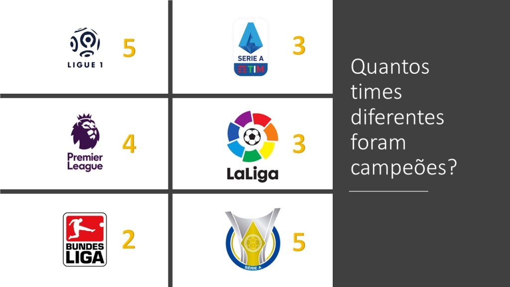 Chama atenção como os números são próximos em quase todas as ligas investigadas com exceção da Bundesliga.
