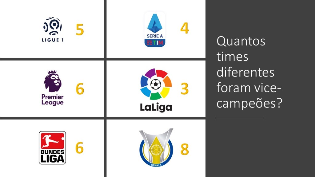 Analisando os números de campeões e vices, é possível traçar um paralelo de qual(is) liga(s) tem uma disputa maior pelo título.