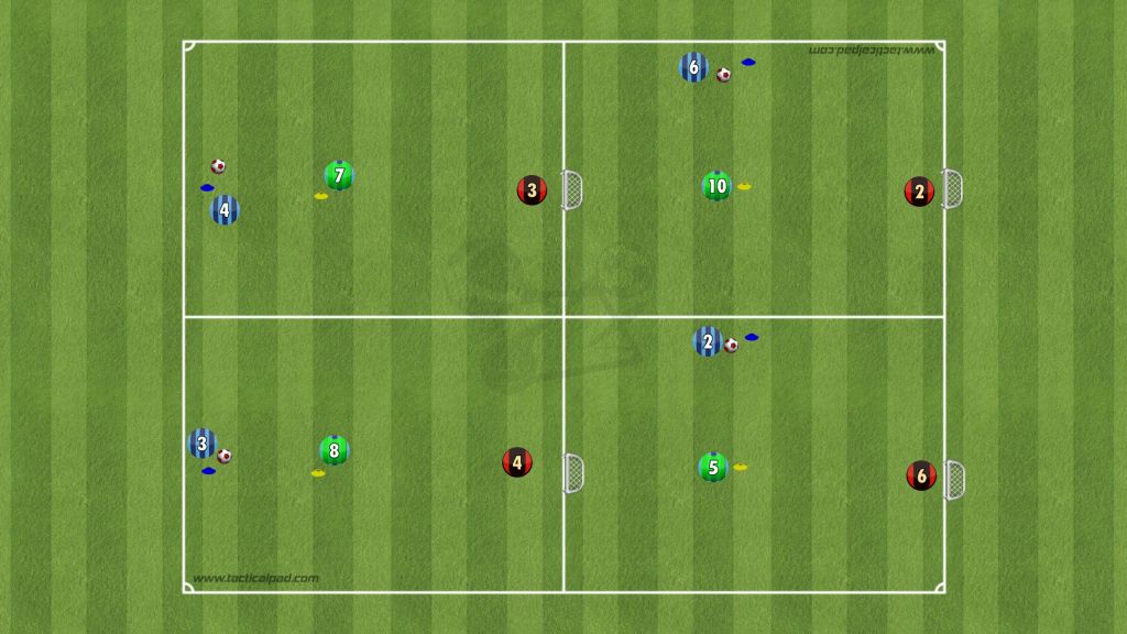 No treino de duelos – Brasil eu busquei estimular a situação de enfrentamento imediatamente posterior a recepção de um passe após identificar a dificuldade de manter a posse da bola ou progredir com bola em um jogo por parte de times sub-10 e sub-11.