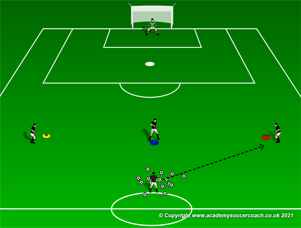 - Eu fortemente recomendo focar em realmente levar os jogadores ao entendimento de ponto A (posição atual) e ponto B (ponto futuro). Encoraje seus jogadores a reconhecer que na maioria das vezes no terço final nós não queremos estar parados no ponto B antes que a bola seja cruzada ou passada. Primeiro motivo: é mais fácil marcar um jogador parado. Segundo motivo: o jogador conseguirá imprimir mais força e velocidade estando na corrida do que parado.