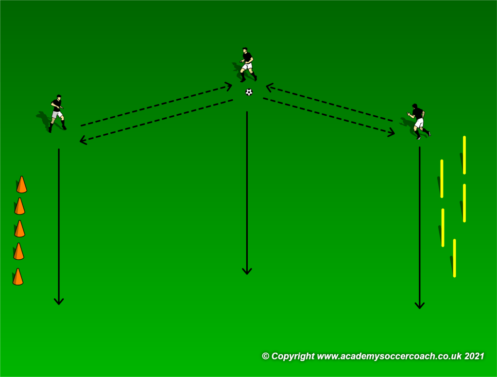 Em trios, um jogador posicionado no meio dos outros dois que estarão bem abertos. Este jogador central irá passar a bola para um lado, receber de volta, girar e passar a bola para o outro. Este padrão deve se repetir enquanto o trio avança pelo espaço. Quando chegarem ao final da área determinada, os três devem voltar ao início, passando por um circuito de agilidade e coordenação motora no caminho.