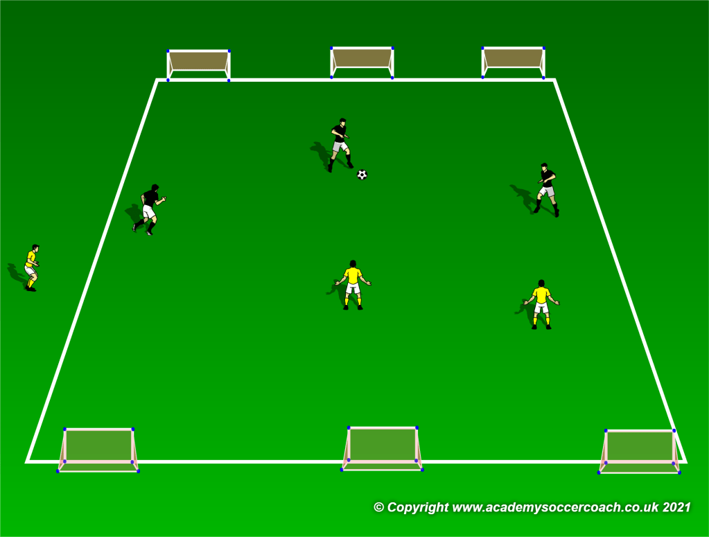 Coletivo 7×7 com os três mini-gols em cada linha de fundo. Encoraje os times a jogarem em 2-3-2, com o meia central descendo entre os zagueiros para fazer a construção de jogo conforme praticado ao longo do treino.