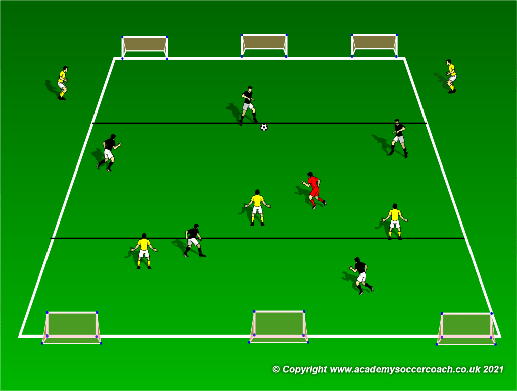Jogo reduzido 5×5+1 com três golzinhos em cada linha de fundo. O campo é dividido em 3 zonas. O time em ataque deve posicionar-se com 3 jogadores na construção e 2 jogadores no terço final que não podem entrar em outra zona. Quando time estiver sem bola, os 2 jogadores do terço final saem do jogo até que o time deles ganhe a bola. O coringa joga apenas no terço médio.