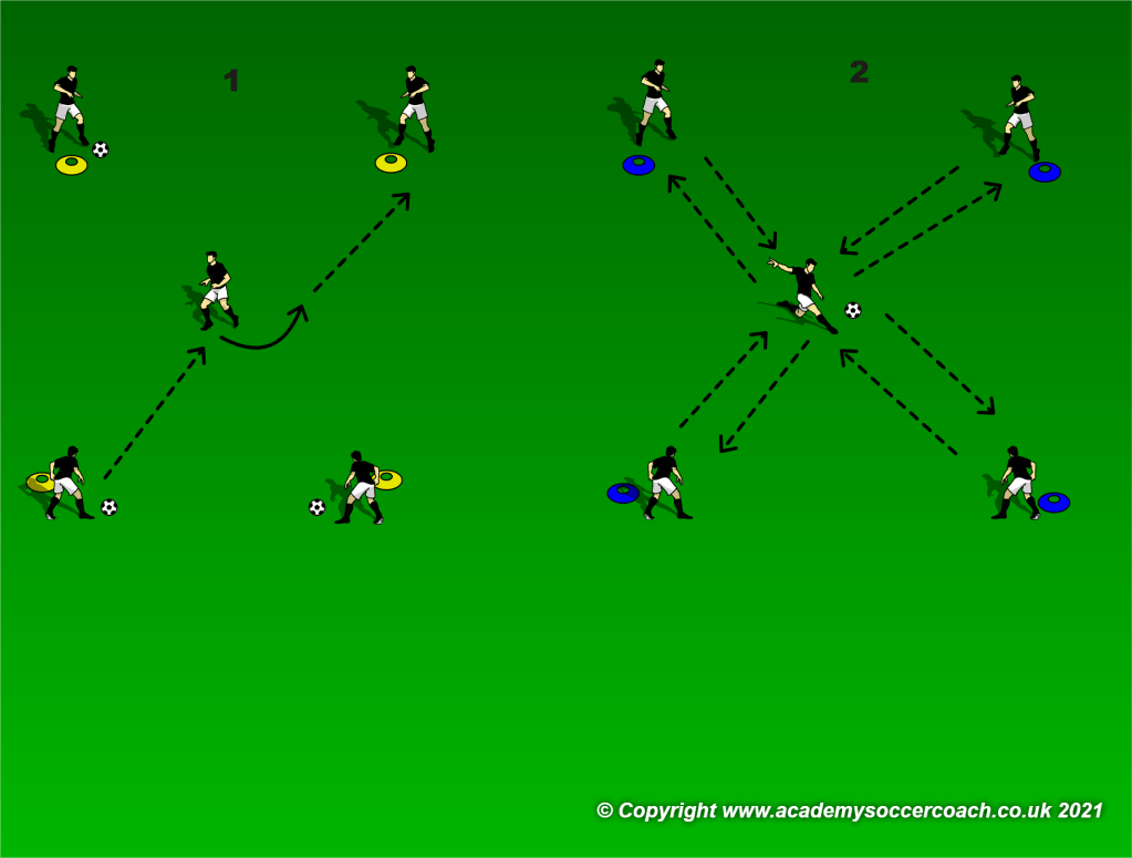 Logo que isso acontece, #1 corre para o cone oposto ao #2 e, o jogador posicionado no cone oposto ao #2 (#4) corre para dentro do quadrado.