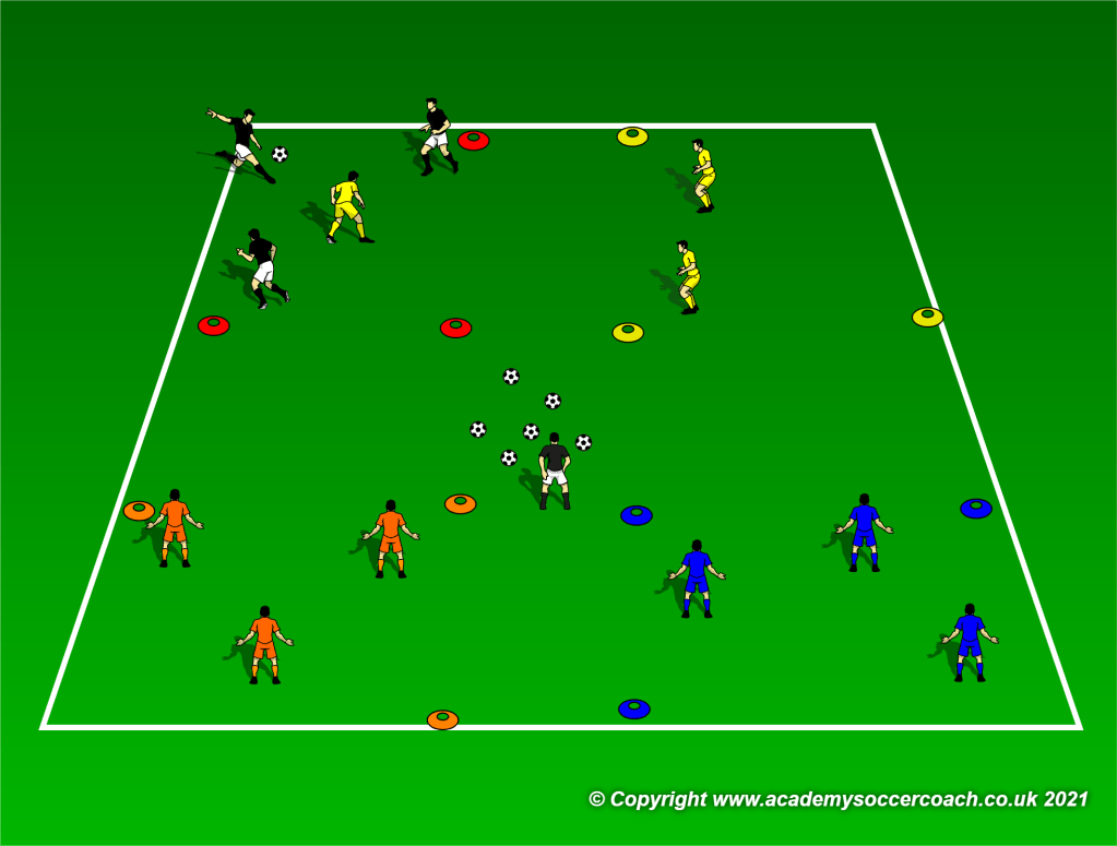 - Posicione cones nas laterais, para forçar os jogadores a se movimentarem e abrirem linha de passe para que a bola não bata nos cones.