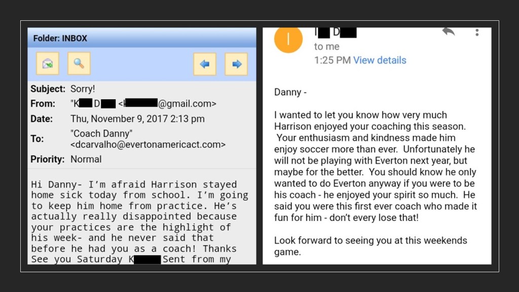 Mãe agradecendo e me dando crédito total pela filha ter começado a cabecear a bola, jogar com mais ímpeto e se comunicando melhor.Esquerda: Oi Danny – Infelizmente o Harrison chegou doente da escola hoje. Ele não vai ao treino hoje. Ele está muito decepcionada pois os seus treinos são o melhor momento da semana dele – e ele nunca disse isso antes de você ser o treinador dele!” Direita: Danny, Gostaria que você soubesse o quanto Harrison curtiu ser treinado por ti nesta temporada. O seu entusiasmo e bondade fizeram ele curtir futebol mais do que nunca. Infelizmente ele não continuará no Everton ano que vem, talvez por bem. Você deve saber que de qualquer maneira ele apenas ficaria no Everton se você fosse ser o treinador dele – ele gostou demais do seu jeito de ser. Ele disse que você foi o primeiro professor que fez futebol ser divertido pra ele – nunca perca isso!”