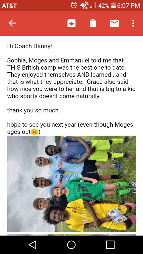 “Hey Danny – Passei no time da minha escola e tenho sido titular e jogando todos os minutos de todos os jogos. Estamos na fase final de New England que começa essa semana e viajaremos bastante. Eu só quero dizer obrigado por me ajudar a me desenvolver como jogador. Eu não acho que eu estaria onde estou como jogador se não fosse por você. Este é um vídeo de um dos meus gols de pé esquerdo (não dominante)”1- “Oi Danny – Michael disse ‘Ele é legal e mais divertido que outros professores. Não muitos exercícios e mais jogos divertidos do que outros professores menos divertidos’. Michael realmente parece curtir mais futebol com você envolvido!” 2- “Oi Danny – Eu gostaria de agradecer por uma grande temporada. Jonathan teve uma ótima primeira temporada de futebol travel. Ele disse “INCRÍVEL!!!”. Ele ama como você o faz trabalhar duro e ele se divertiu muito. Obrigado novamente e espero vê-lo de novo em breve.” 3- “Oi Danny – Obrigado pela ótima temporada. Ryan realmente curtiu esta temporada com você liderando o time. Em particular ele gostou como você trabalhou com ele e o mostrou como chutar a bola no alto. Ele gostou dos exercícios/jogos/coletivos que você organizou e comandou nas aulas. Durante os jogos, ele gostou de como você fazia rodízio de posições e não os mantinha na mesma posição pela temporada toda. Ele ficou muito feliz de estar no seu time nesta temporada. Boa sorte no seu futuro como treinador! Todos sentiremos sua falta”